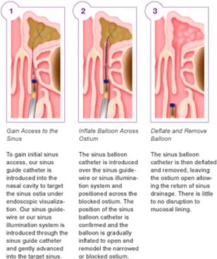 While the use of any surgical instrument involves some risk, the Balloon Sinuplastyâ„¢ technology is minimally invasive and has been clinically demonstrated to be safe by leading ear, nose and throat doctors around the world. Furthermore, balloon catheter technology has been used successfully in other medical procedures such as balloon angioplasty for the heart. Side effects are rare, and the complication rate is low. View the images below to see how the balloon sinuplasty procedure is performed.